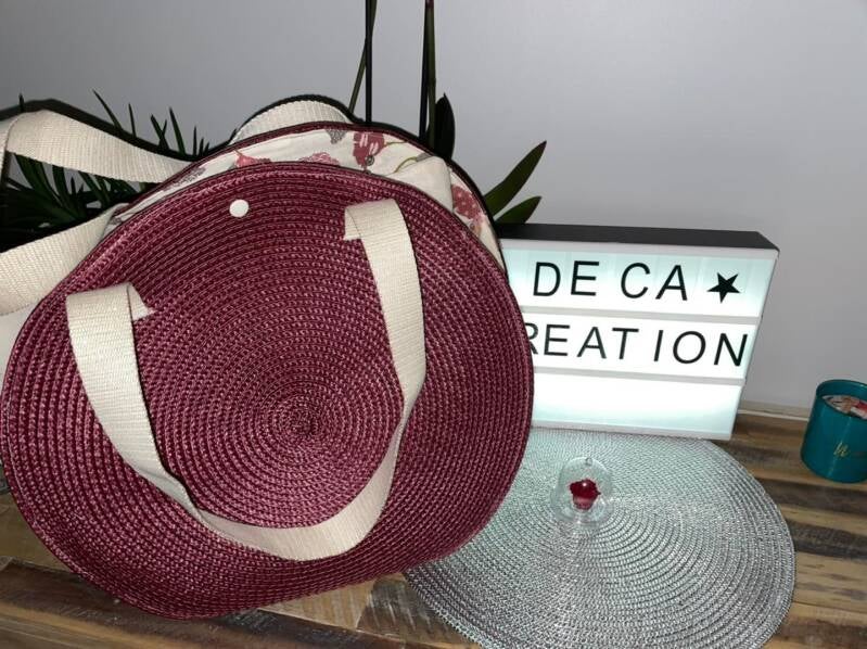Crée à partir d’un set de table et renforcé avec une toile de coton intérieure et sur les côtés, ce sac est parfait pour l’été avec son style estival.